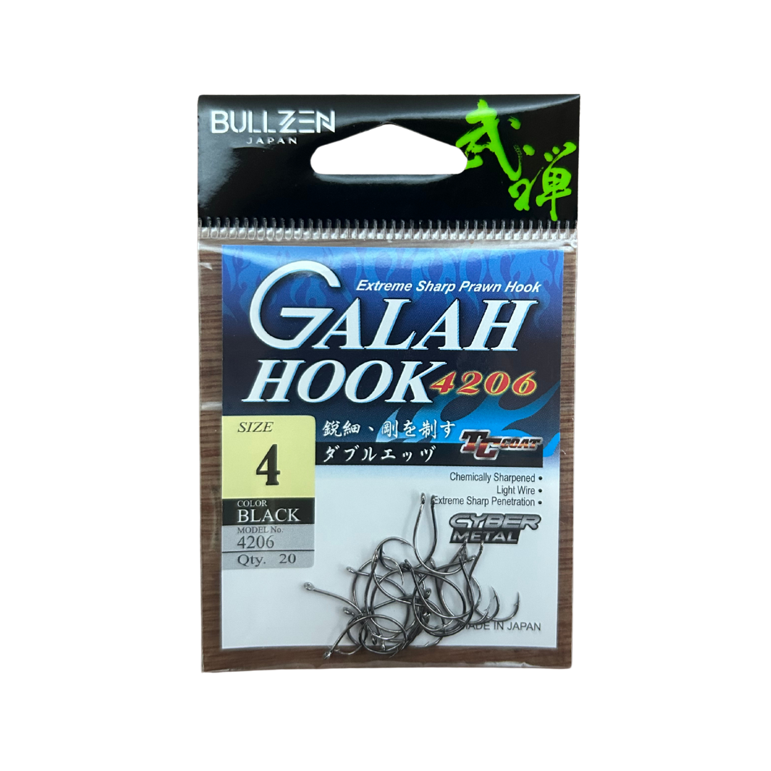 BULLZEN TC Galah Hook 4206 ialah mata kail yang direka khas untuk pancingan ikan galah dan ikan air tawar lain. Bentuk mata kail yang panjang dan tajam membantu cangkukan lebih kemas, sesuai digunakan bersama umpan seperti cacing, perumpun atau umpan hidup. Mata kail ini sesuai untuk pemancing kolam, sungai dan parit.