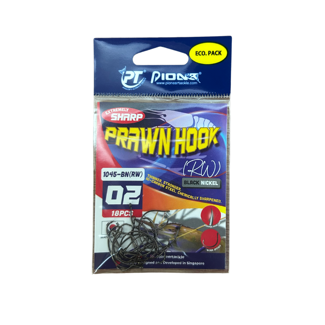 PIONEER Prawn Mata Maut Hook 1045-BN (RW) ialah mata kail pancing khusus untuk teknik pancingan udang (prawn hook) dan ikan kecil hingga sederhana. Direka untuk memberikan ketajaman tinggi, pegangan kuat dan penetrate efektif, ia sesuai dijadikan pilihan utama pemancing yang menggunakan umpan hidup seperti udang, anak ikan atau soft bait kecil. Produk ini terkenal kerana bentuknya yang diperhalusi untuk meningkatkan kadar hook-up dan menjadikan strike lebih konsisten dalam pelbagai keadaan memancing.
