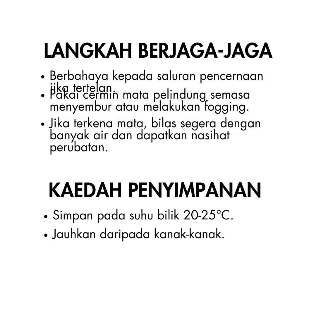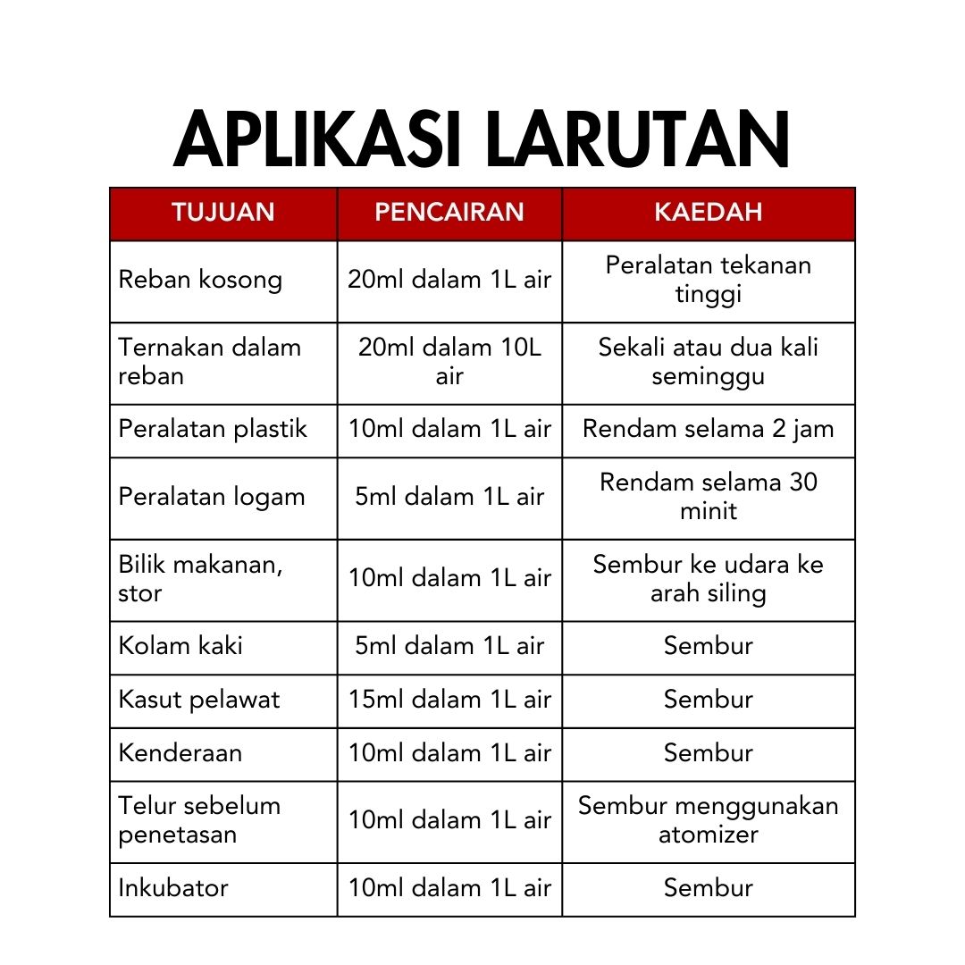 • Mudah digunakan — hanya perlu dicairkan dan disembur/mist ke lantai, dinding, peralatan, reban atau kandang.