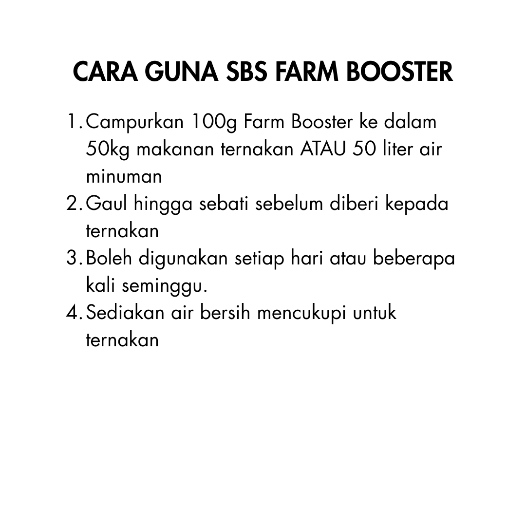 Campurkan 100g Farm Booster ke dalam 50kg makanan lembu atau 50 liter air minuman untuk hasil terbaik.