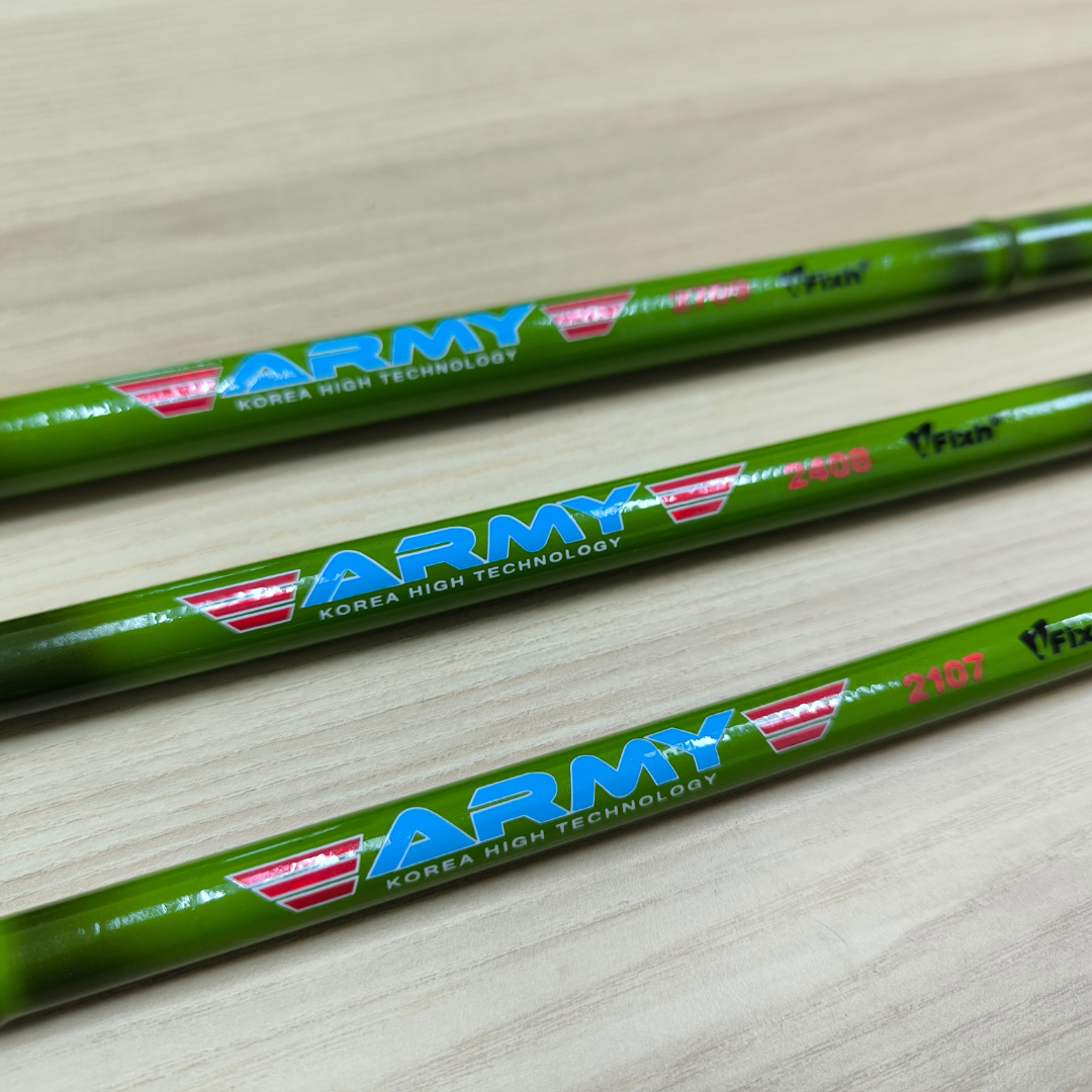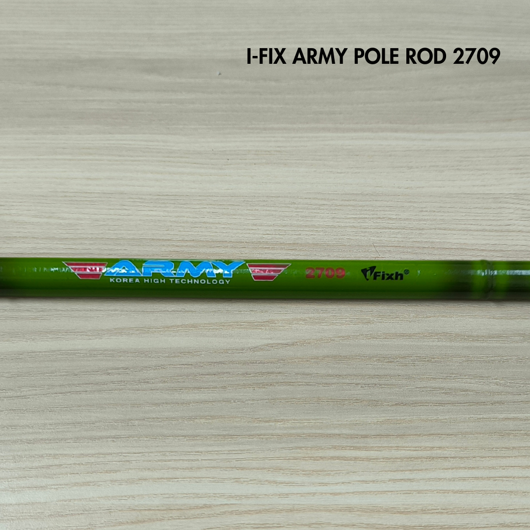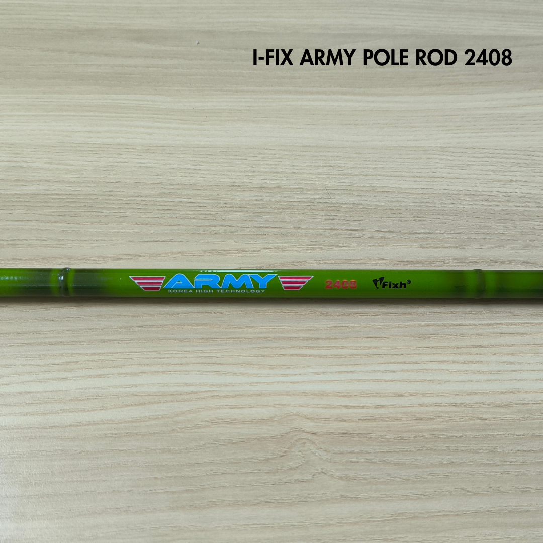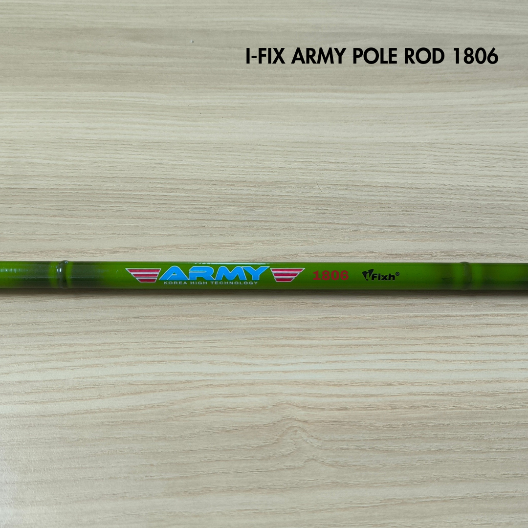 I-FIX Army Pole Rod ialah joran pancing jenis pole rod (tanpa reel) yang direka untuk kegunaan pancingan ringan hingga sederhana. Joran ini ringan, seimbang dan mudah dikawal, sesuai untuk pemancing yang gemar teknik pancingan tradisional di kolam, sungai atau parit. Dengan binaan yang kukuh dan fleksibel, memberikan kawalan yang baik ketika menaikkan ikan serta selesa digunakan untuk tempoh yang lama.