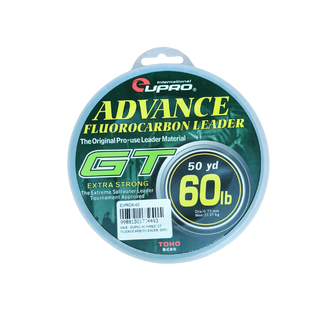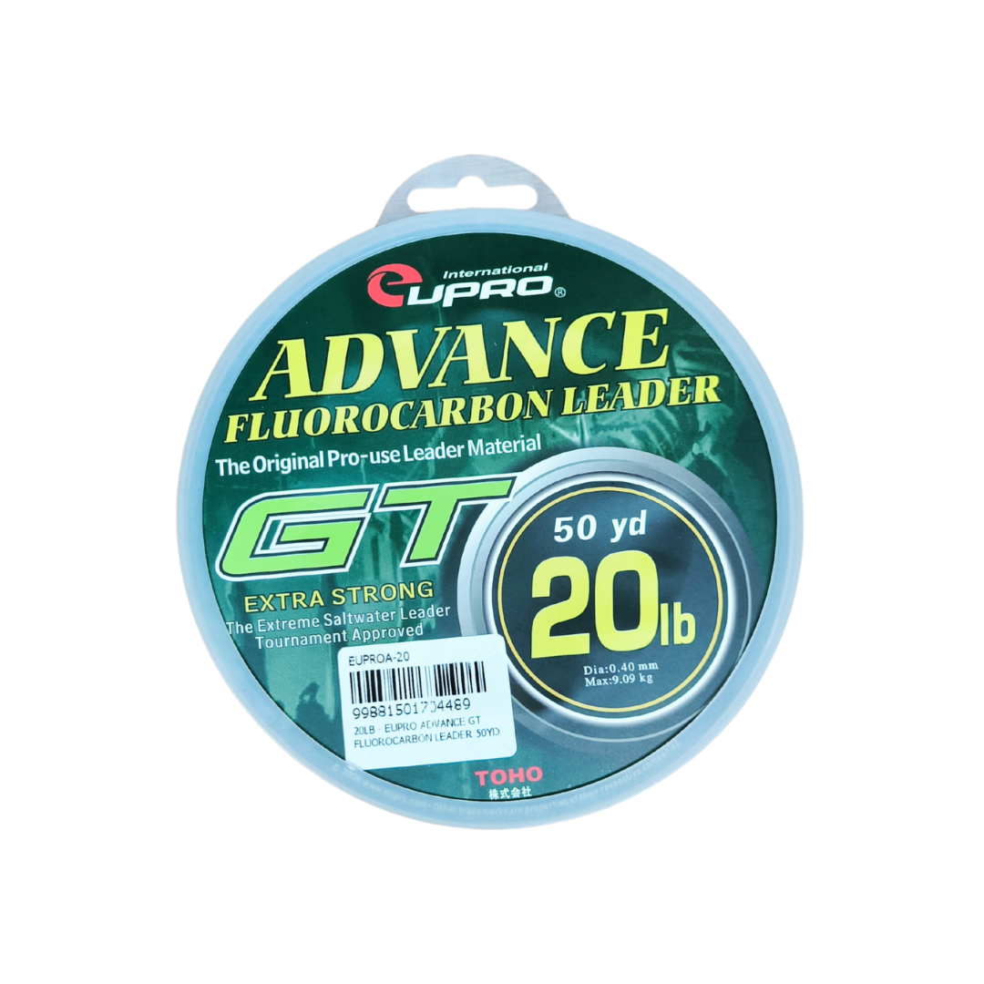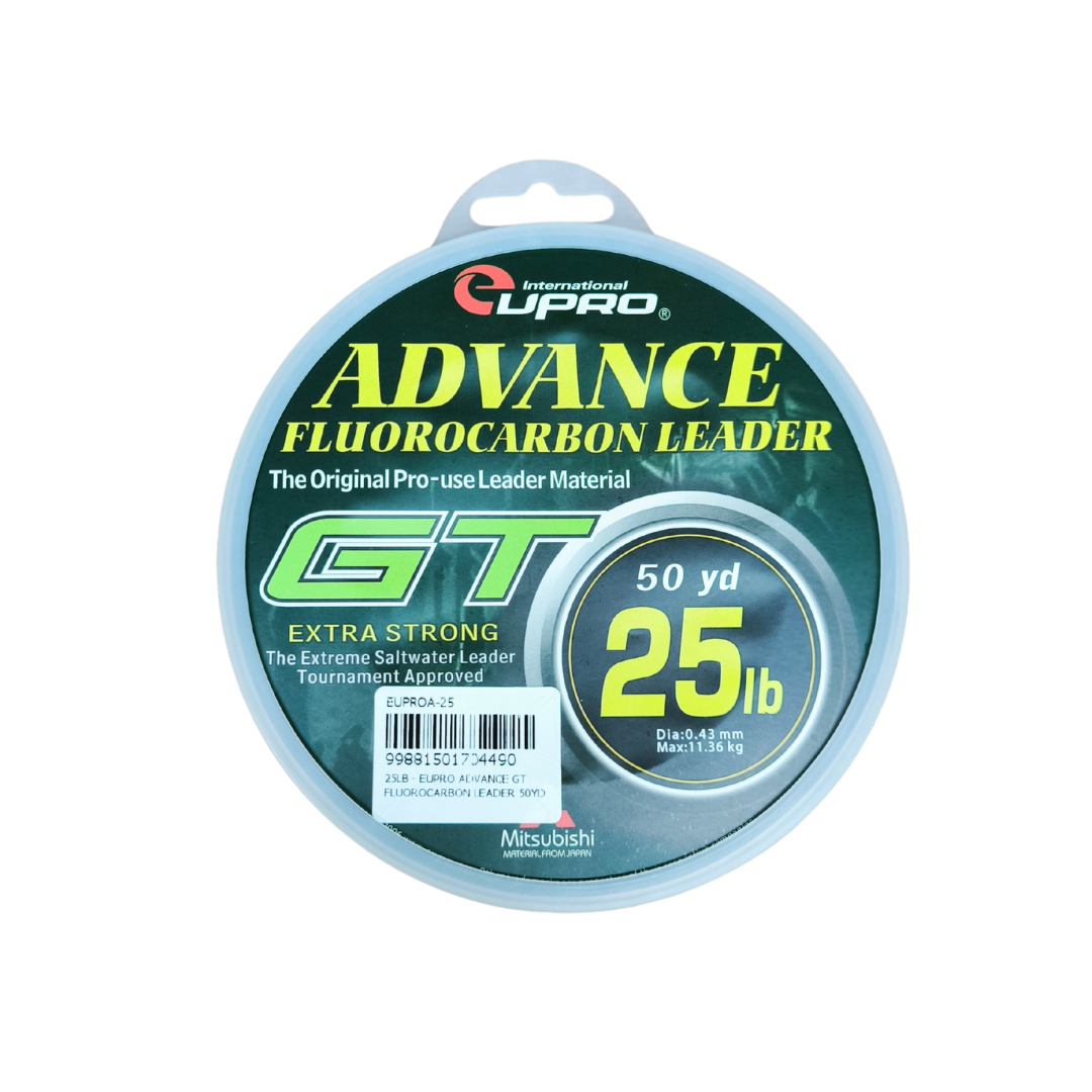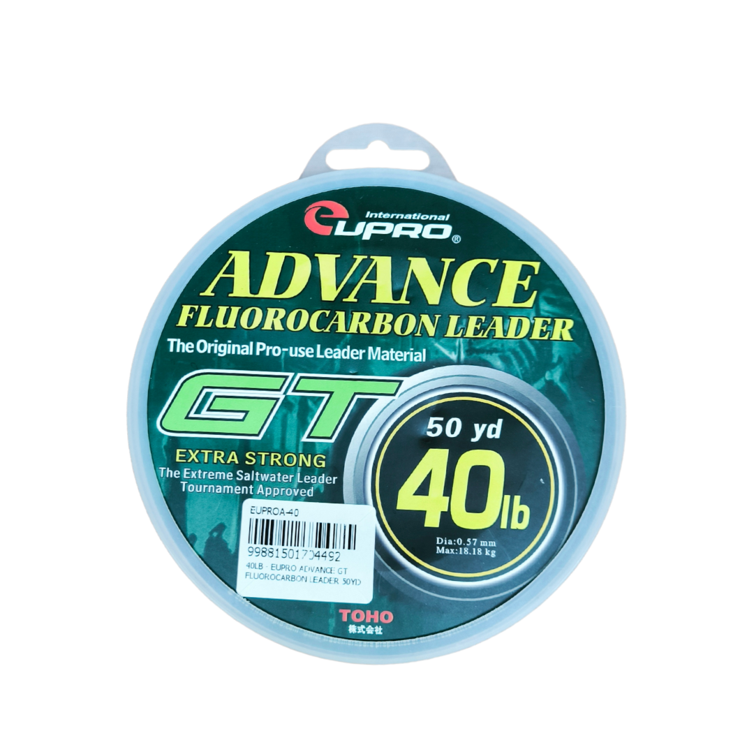 EUPRO Advance GT Fluorocarbon Leader ialah tali perambut fluorocarbon berkualiti tinggi khusus direka untuk pancingan GT (Giant Trevally) dan ikan besar lain yang memerlukan leader tahan lasak serta hampir tidak kelihatan di dalam air. Dengan panjang 50 yard (±45.7 m) serta material fluorocarbon yang unggul, tali ini menawarkan ketahanan terhadap geseran dan tekanan tinggi, menjadikannya pilihan utama bagi teknik berat, termasuk jigging, popping dan trolling di laut. Fluorocarbon juga mempunyai indeks refraksi hampir sama dengan air, menjadikan ia sukar dilihat ikan, satu kelebihan penting ketika memancing ikan yang berhati-hati dan agresif seperti GT, GT kecil, GT besar, siakap laut dan spesis predator besar.