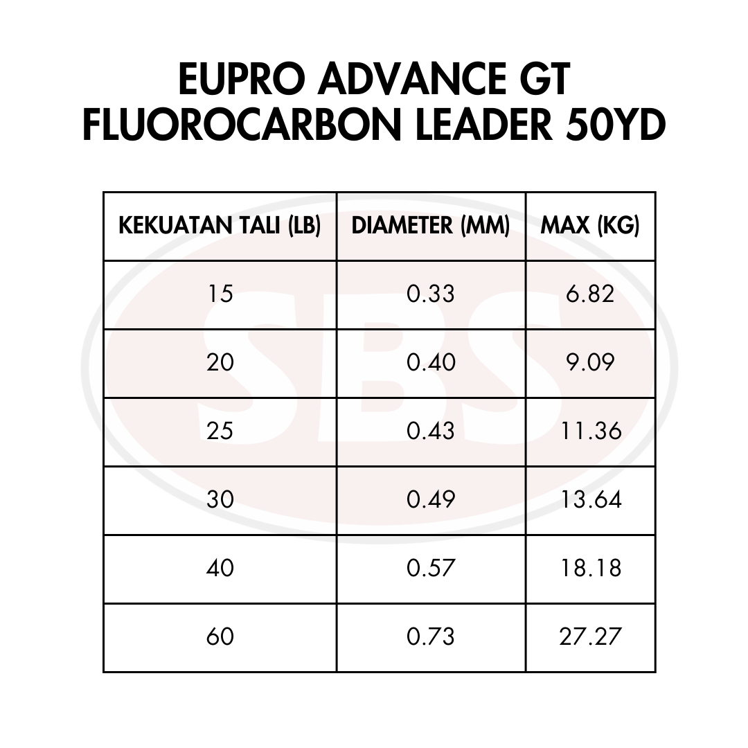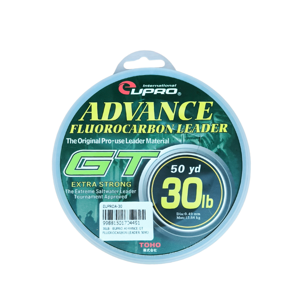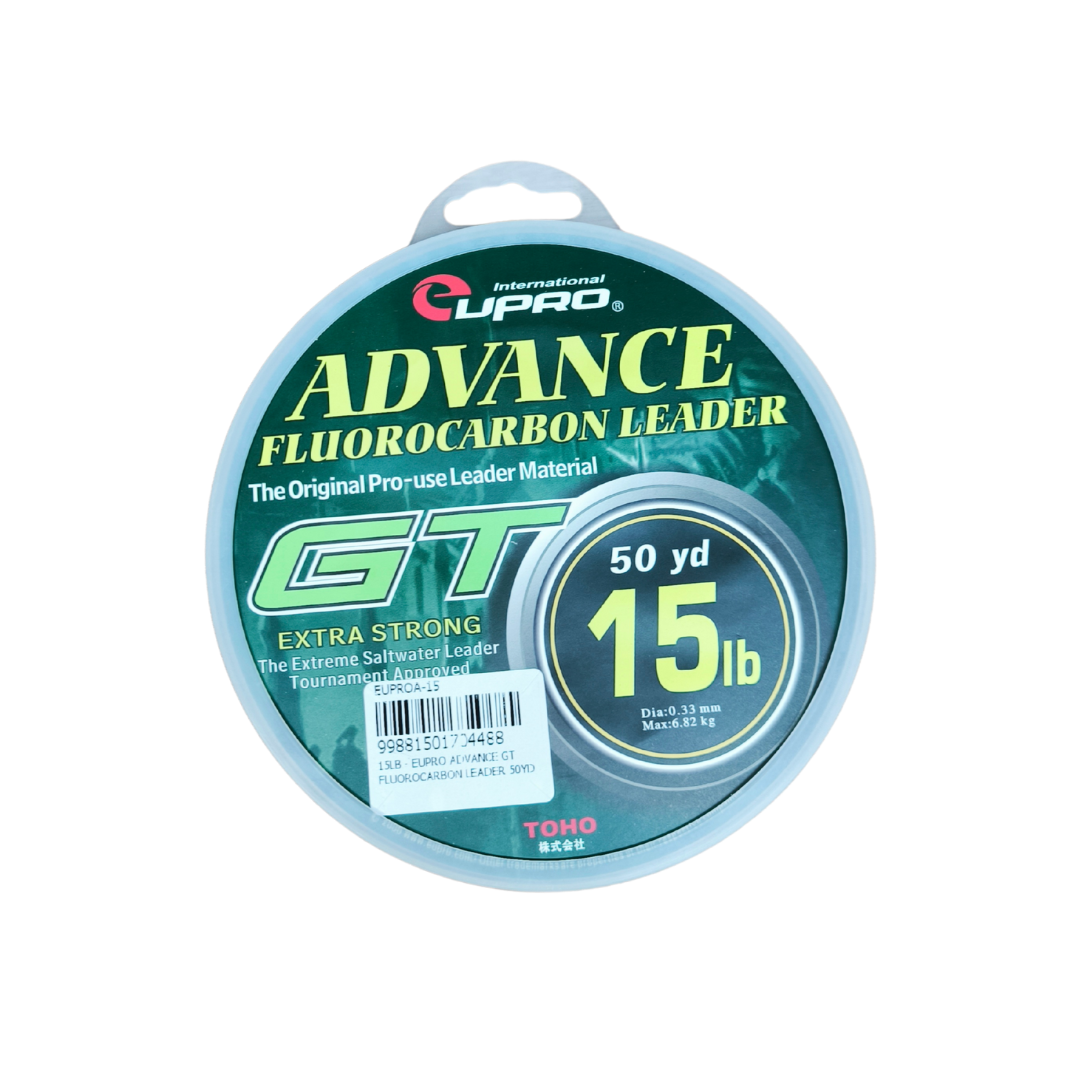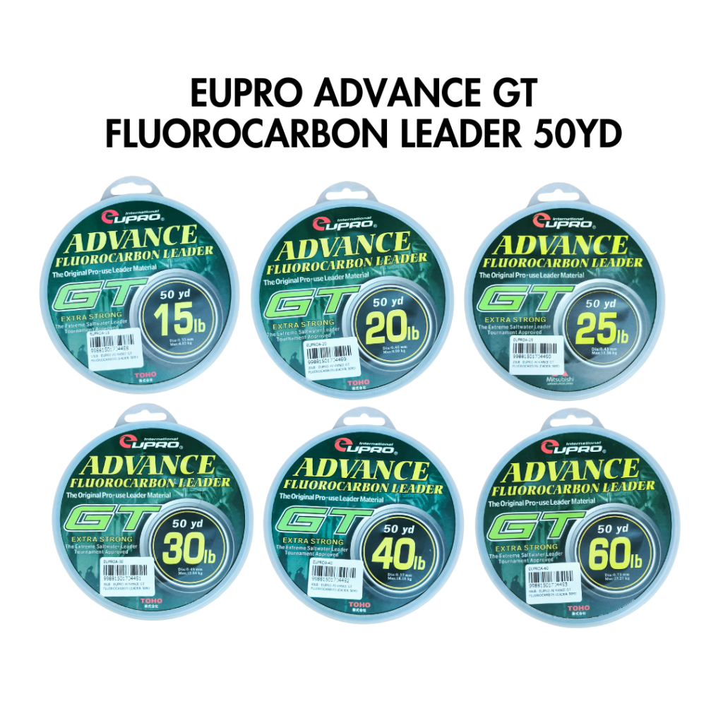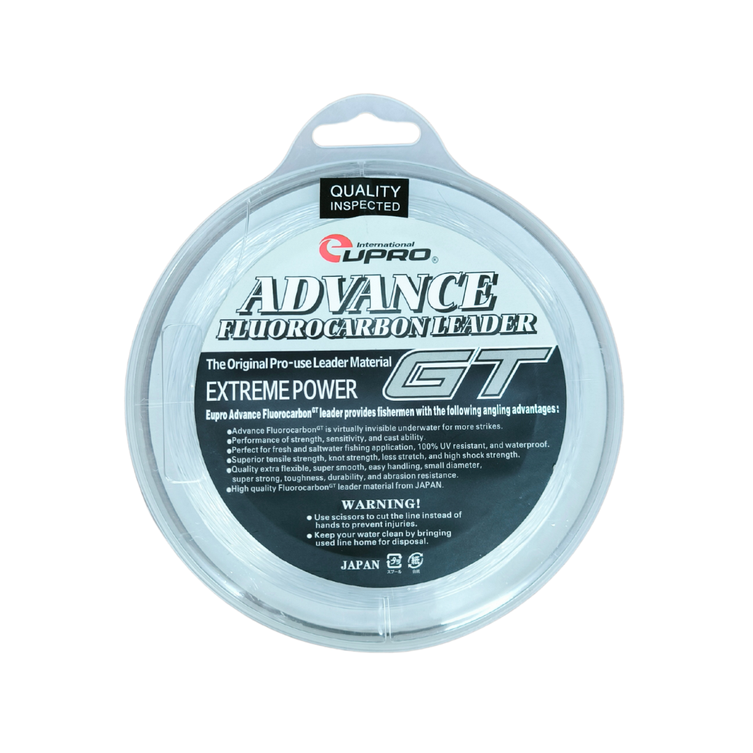 EUPRO Advance GT Fluorocarbon Leader ialah tali perambut fluorocarbon berkualiti tinggi khusus direka untuk pancingan GT (Giant Trevally) dan ikan besar lain yang memerlukan leader tahan lasak serta hampir tidak kelihatan di dalam air. Dengan panjang 50 yard (±45.7 m) serta material fluorocarbon yang unggul, tali ini menawarkan ketahanan terhadap geseran dan tekanan tinggi, menjadikannya pilihan utama bagi teknik berat, termasuk jigging, popping dan trolling di laut. Fluorocarbon juga mempunyai indeks refraksi hampir sama dengan air, menjadikan ia sukar dilihat ikan, satu kelebihan penting ketika memancing ikan yang berhati-hati dan agresif seperti GT, GT kecil, GT besar, siakap laut dan spesis predator besar.
