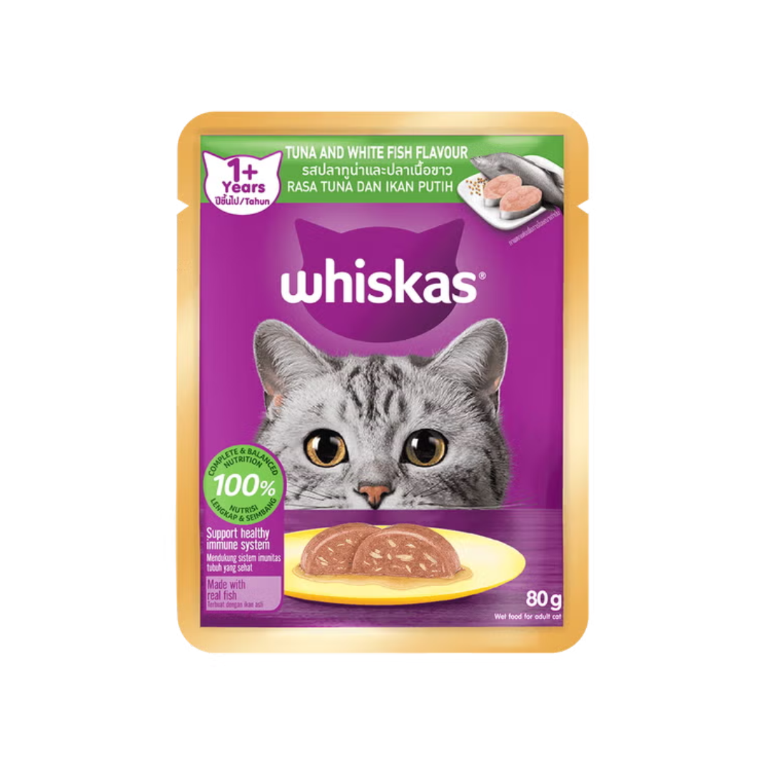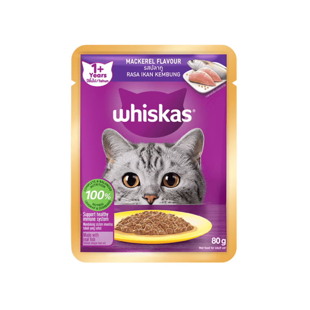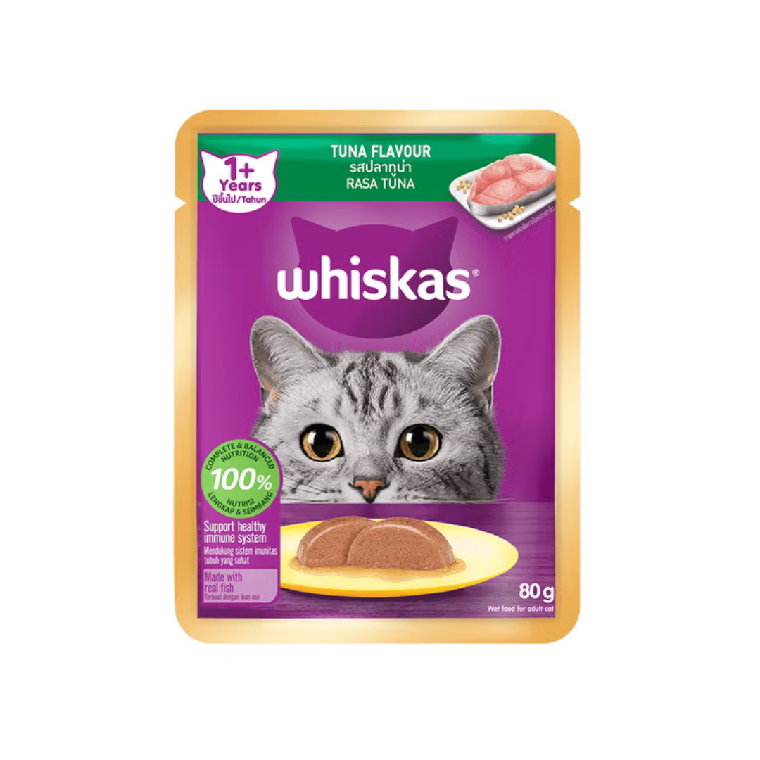 Whiskas Wet Food Pouch 80g ialah makanan basah lengkap dan seimbang yang dirumus khas untuk kucing dewasa berumur 1 tahun ke atas serta pilihan khas untuk kucing senior 7+ tahun. Ia diformulasikan bagi memenuhi keperluan nutrisi harian kucing dengan gabungan protein berkualiti, vitamin dan mineral penting untuk menyokong kesihatan menyeluruh serta gaya hidup aktif kucing.