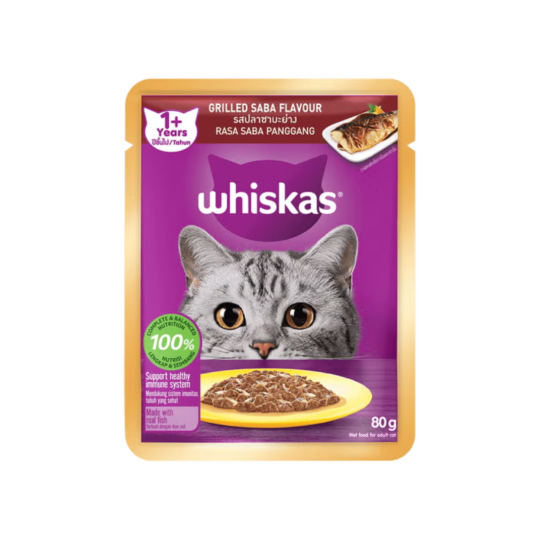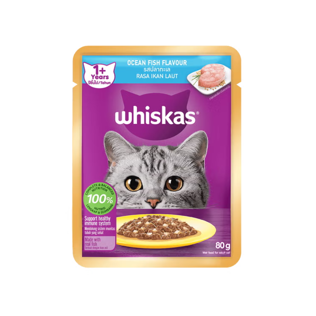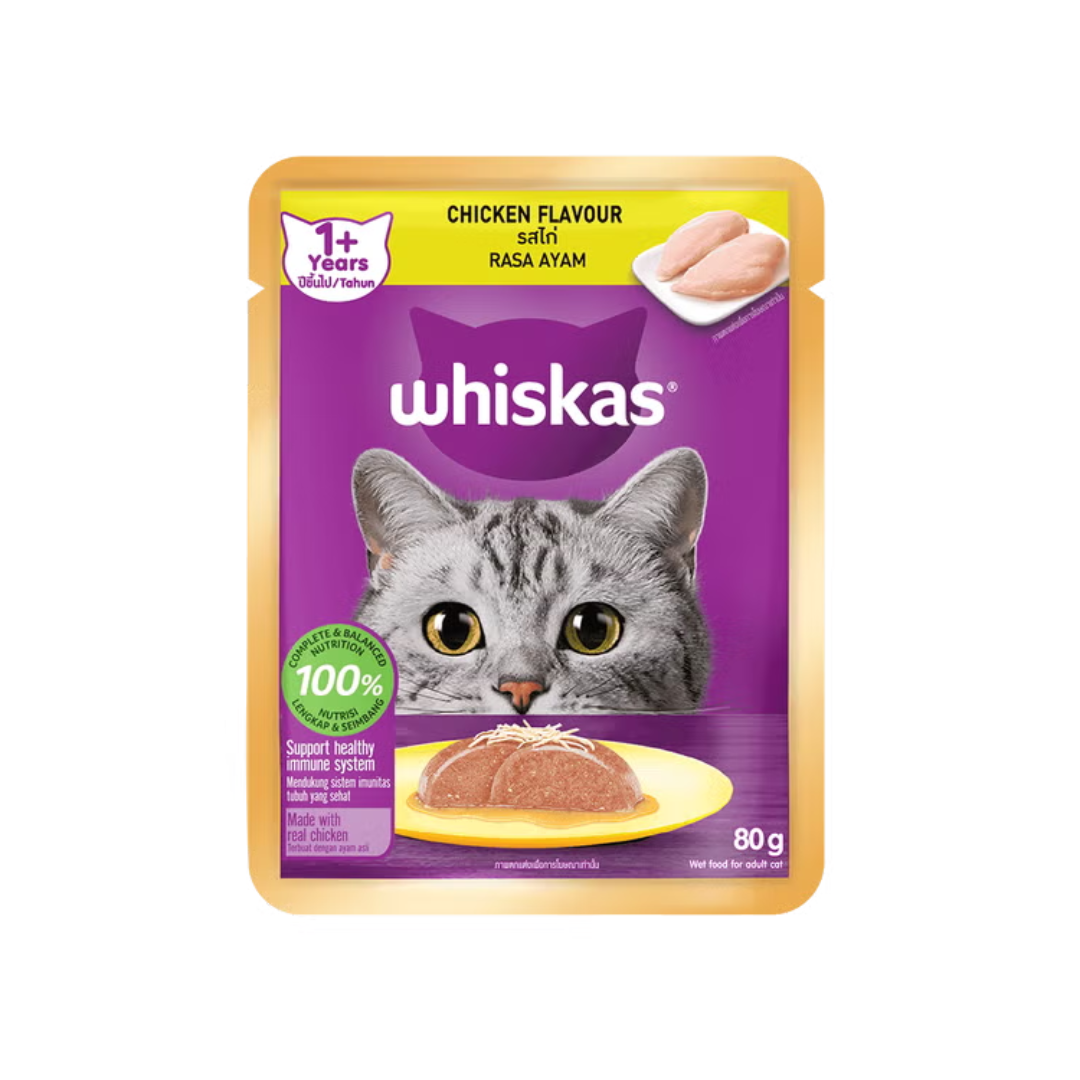Whiskas Wet Food Pouch 80g ialah makanan basah lengkap dan seimbang yang dirumus khas untuk kucing dewasa berumur 1 tahun ke atas serta pilihan khas untuk kucing senior 7+ tahun. Ia diformulasikan bagi memenuhi keperluan nutrisi harian kucing dengan gabungan protein berkualiti, vitamin dan mineral penting untuk menyokong kesihatan menyeluruh serta gaya hidup aktif kucing.