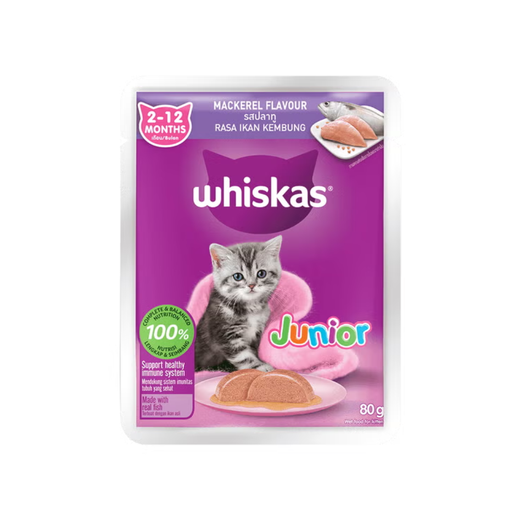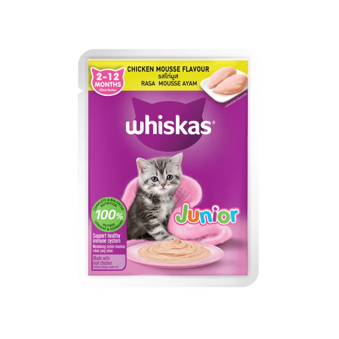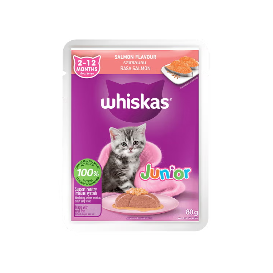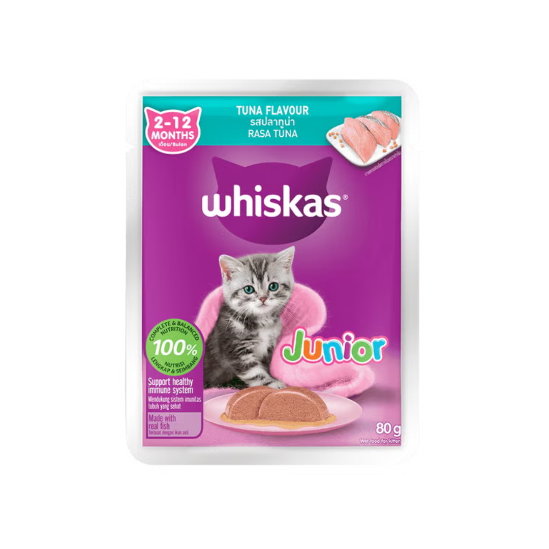 Whiskas Junior Pouch ialah makanan basah lengkap dan seimbang yang diformulasikan khusus untuk anak kucing (kitten) biasanya umur 2 bulan hingga 12 bulan. Ia mengandungi nutrien penting untuk menyokong pertumbuhan awal yang sihat, sistem imun yang kuat, dan tenaga yang diperlukan untuk aktiviti harian anak kucing yang aktif. Makanan basah ini diproses dengan tekstur lembut dan berjus yang sangat menarik selera anak kucing, memudahkannya makan dan mencerna makanan. Ia juga merupakan pilihan ideal bagi kucing yang baru disapih atau sedang belajar makan makanan selain susu.